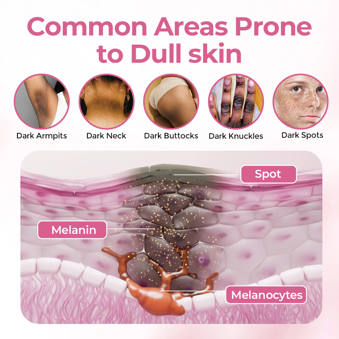 With regular use, it supports a smoother-looking surface and a more even-looking tone, especially where friction and dryness can make skin look dull or uneven.