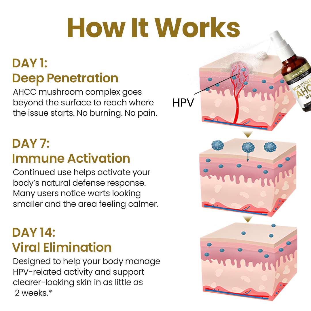 Biancat® WartoClear AHCC Spray is formulated to support immune response and help reduce the chances of repeat flare-ups, aiming to break the frustrating cycle of “clear, then return.”