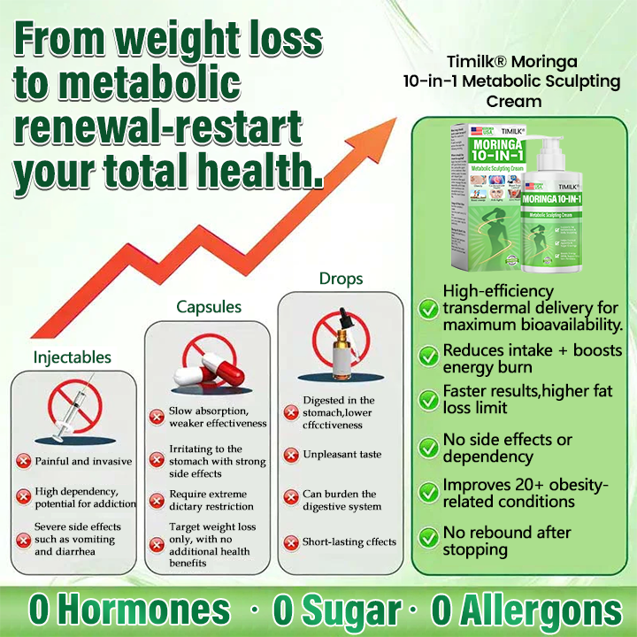 ✅ Timilk® Moringa 10-in-1 Metabolic Sculpting Cream breaking away from the burden of traditional injectable or oral weight-loss products, this advanced nano microneedle transdermal delivery system gently and steadily releases active ingredients for up to 8 hours. Core ingredients Moringa and 𝐁𝐞𝐫𝗯𝗲𝐫𝐢𝐧𝐞 work synergistically to support appetite management and lipid metabolism, making fat loss feel more natural and effortless—without extreme dieting or physical strain. At the same time, NAD⁺ supports cellular energy levels and skin firmness, helping maintain a healthy, well-toned appearance during body-weight changes. The overall formula is gentle and stable, offering a more comfortable experience for those seeking an effective, non-irritating, and non-injectable approach to weight management.